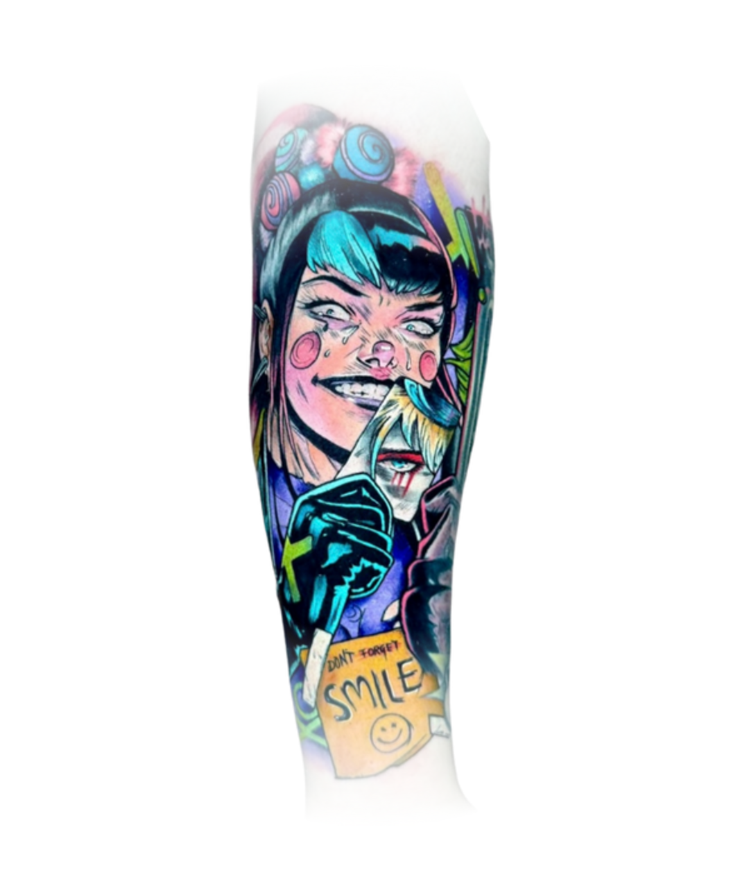 Farbe und Dynamik: Die Linien sind energisch, mit leuchtenden Farben und Kontrasten, die jedes Stück auf der Haut hervorstechen lassen.